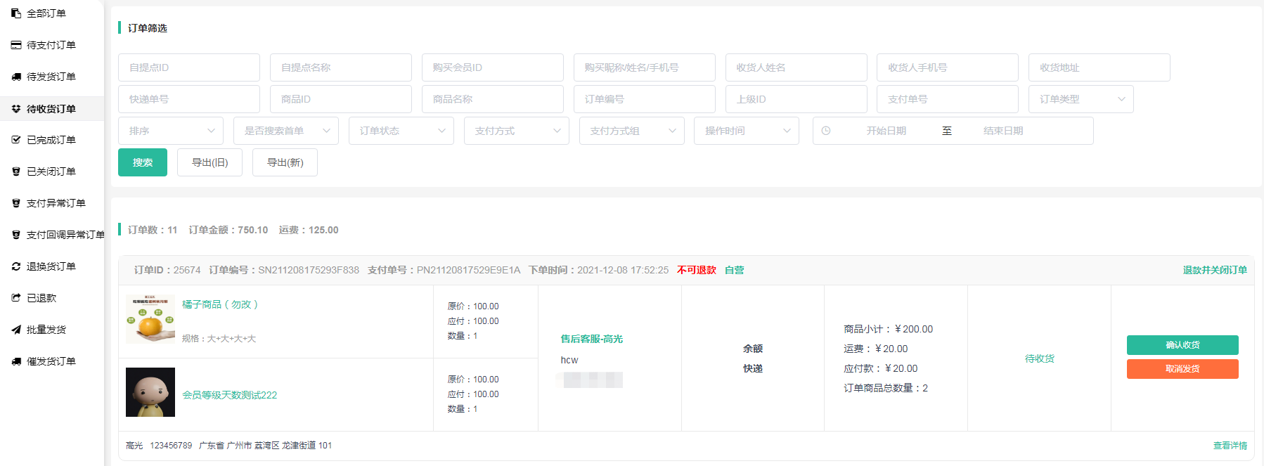 5、后台订单详情中,可以看到有两个包裹的信息