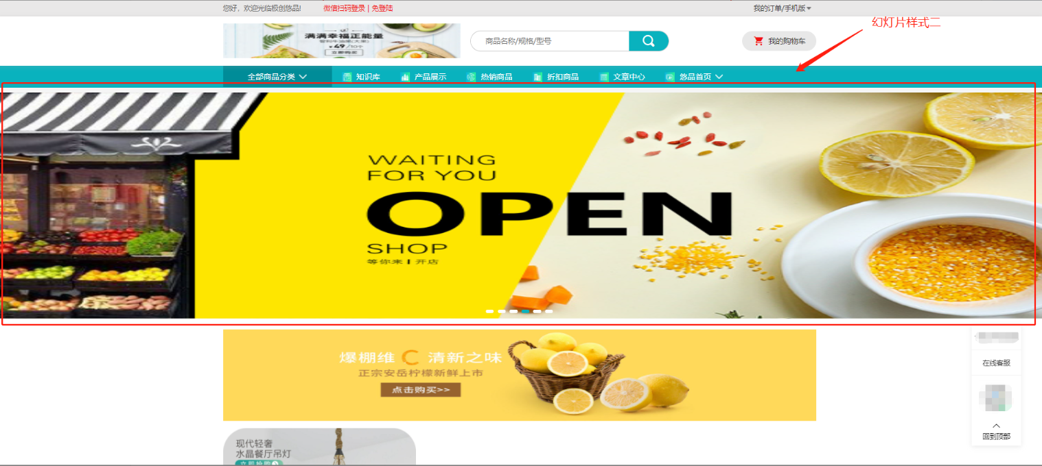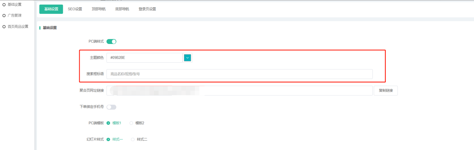 首页设置:设置PC端logo(建议尺寸480 * 70)、幻灯片样式一背景(建议高度400)