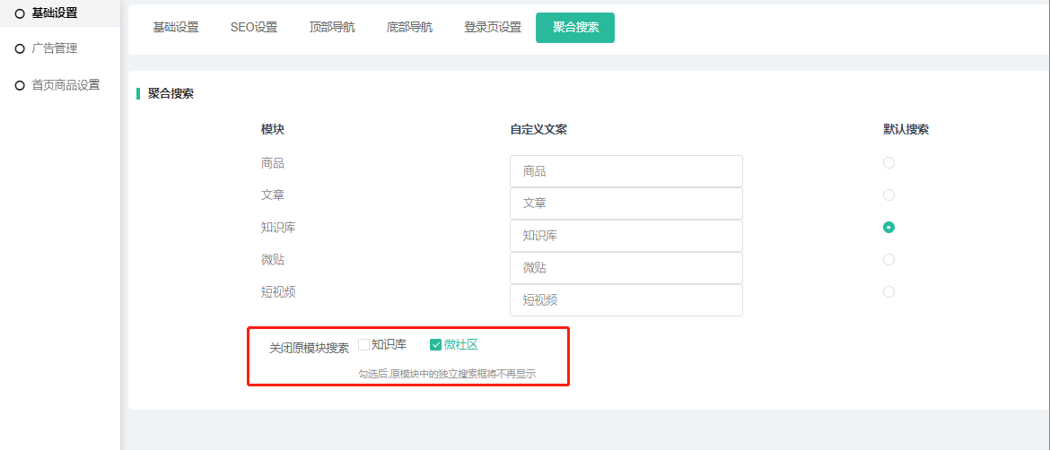 2、关闭原模块搜索:当前仅支持知识库和微社区,勾选后,原模块中的独立搜索框将不再显示。