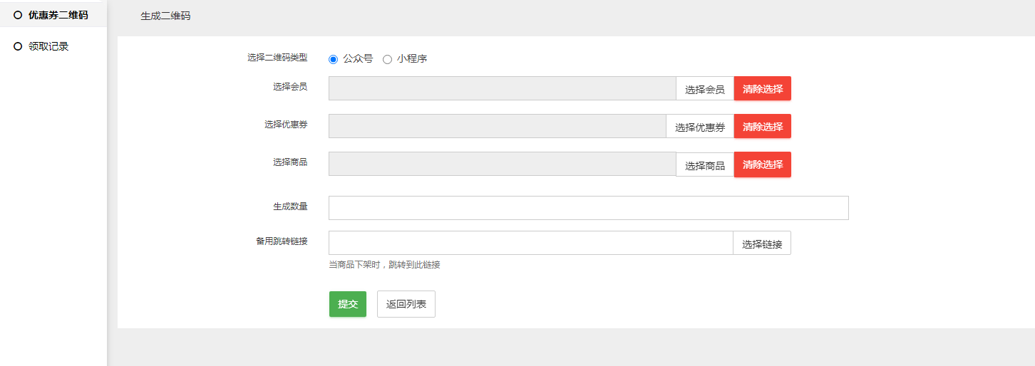 选择二维码类型,选择会员,优惠券,商品,设置生成数量,商品下架的备用跳转链接。