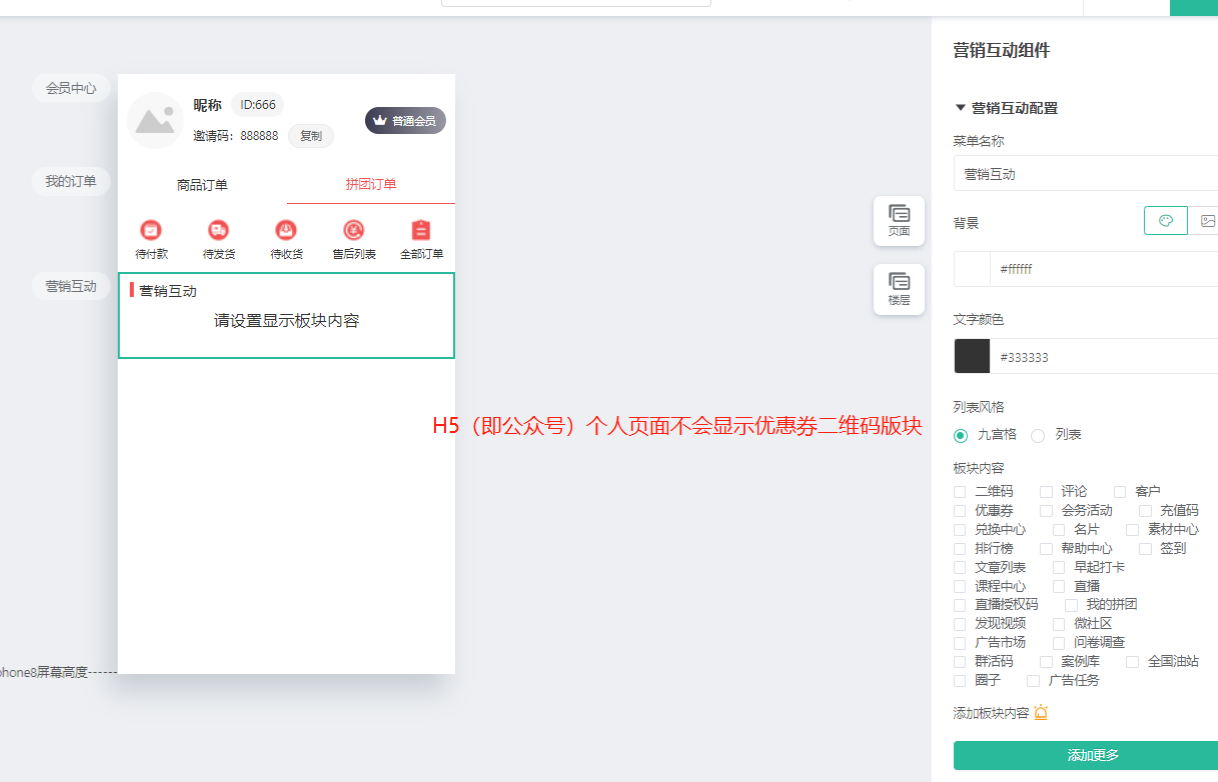 只支持小程序端,小程序个人中心才会有入口,H5端没有,只能通过后台下载获取H5二维码。如下图所示