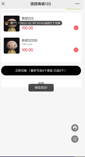 点击绑定兑换码,成功提示绑定成功,返回列表页!