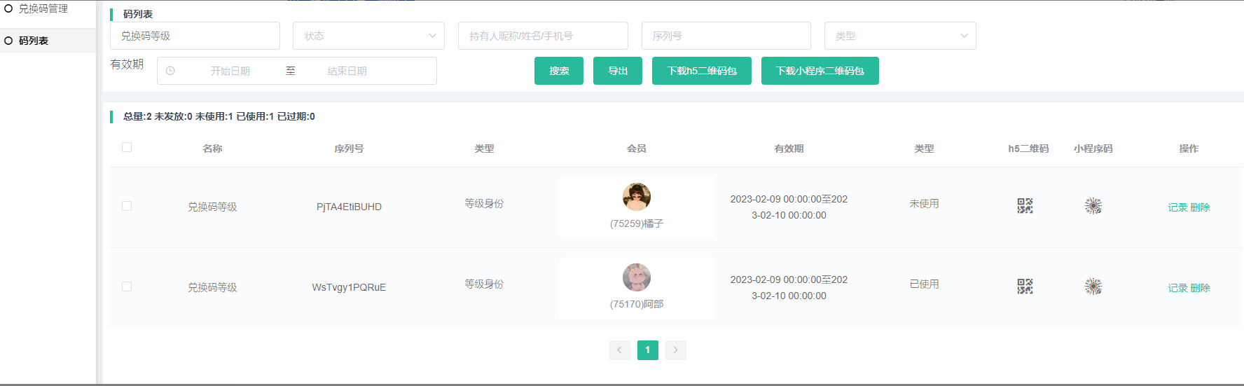 兑换码:显示该兑换码详情数据,点击会跳转到码列表页面(页面展示名称,序列号,类型,会员,有效期,状态,H5二维码,小程序码,操作(记录,删除)