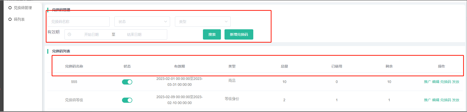 列表显示兑换码名称,状态,有效期,类型,总量,已使用,剩余数量,操作(如下)