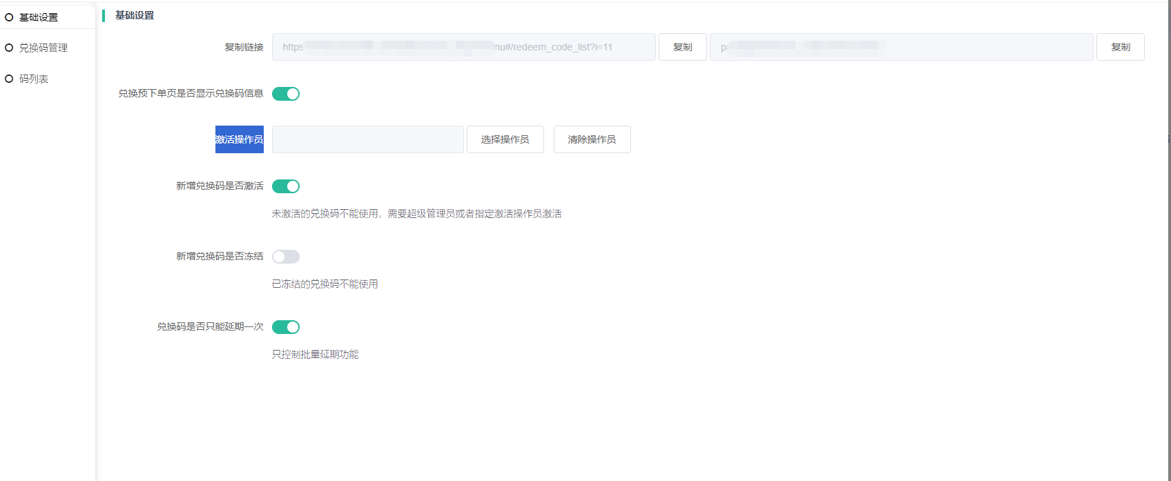 6、兑换码是否只能延期一次:只控制码列表的批量延期功能,即使开启了批量延期只能一次,在兑换码列表或兑换码编辑页面修改兑换码日期还是能修改。