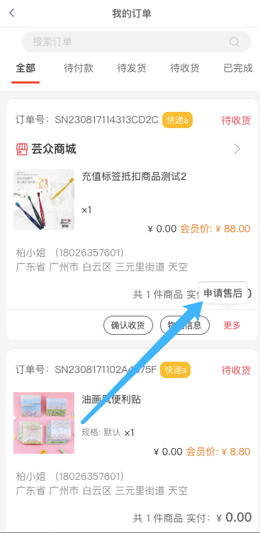 兑换码兑换订单增加申请售后功能,申请售后只能选择换货