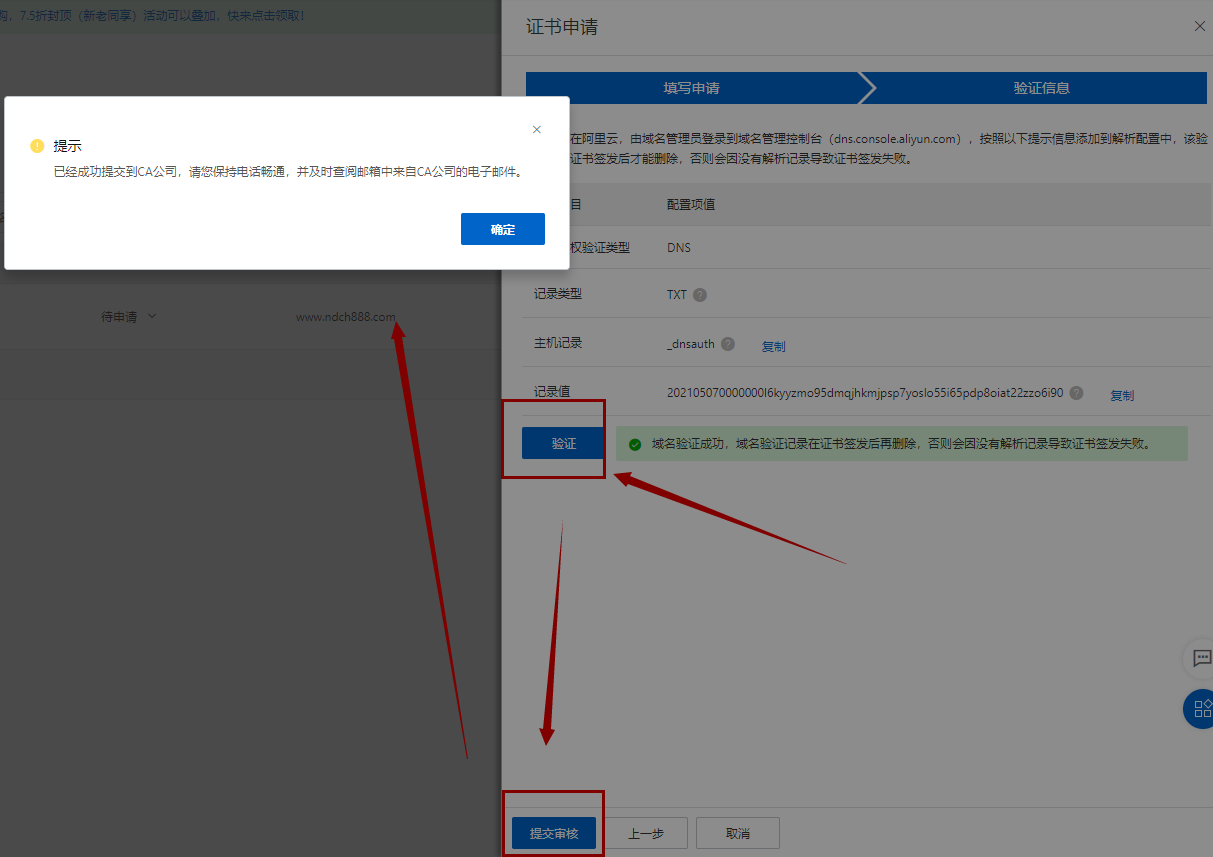 5、下一步-验证-提交审核。(如果你申请证书的域名不在该账号,你需要在域名的管理里,添加一条特定的 DNS 记录,按照以下信息添加)
