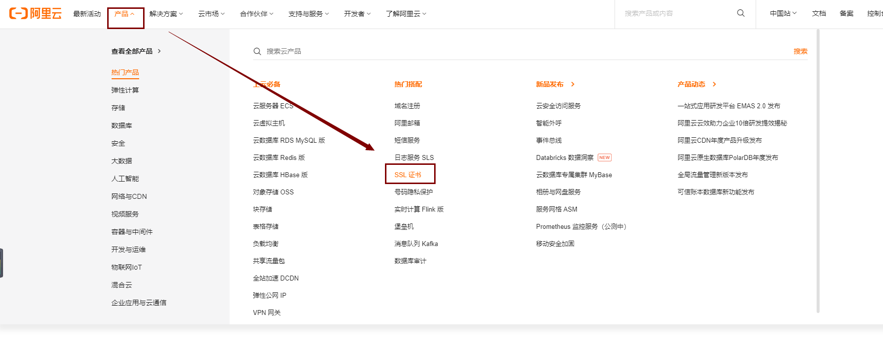 1、登录:阿里云-产品-SSL证书。