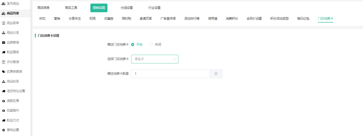 1、赠送门店消费卡:会员购买商品后,是否获赠消费卡。